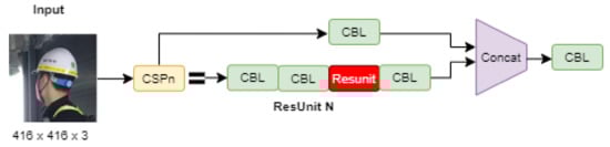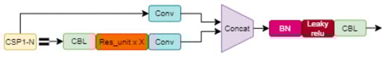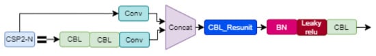 Convolutional neural networks require the input images to be the same size. In conventional convolutional neural networks, fixed input values are obtained through truncation and warping operations. There is also a study in which Yolov4 uses multi-scale local function to improve the demand for fixed input size through SPPNet []. Yu and Zjang, by adding the CSP2-N module to the PANnet structure to combine full functional information and multiple scales, improved the model performance accuracy and functionality. CSP2-N is shown in Figure 6. The neck network of YOLOv4 adopts common convolution operation, and CSPNet has advantages such as excellent learning ability, computing bottleneck, and memory cost reduction. By improving the CSPNet network module based on YOLOv4, the network function convergence function can be further strengthened Ref. []. However, in our experiment, we add the CBL-Resunit structure for the information delivery networks to optimize the connectivity of the neck, and the main role is to use the cross-layer connectivity properties of ResNet to allow the information processing to be distributed through multiple paths in the FPN and PAN. Information and localization are effectively fused through different pathways to improve image processing. The SPPNet network composes functional fusion between other backbone layers at the neck by combining the bottom-to-top deep positioning function, and in PANet, the top-to-bottom calculation method for detailed functions is implemented through this convergence operation. It provides more useful features for predictive networks. The CSP2-N network is shown in Figure 6.