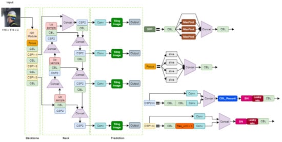 Yu and Zhang and Wang et al. used the small object detection algorithm proposed in this paper divided into input, backbone, network, neck network, and head. After image super resolution processing is performed on the input part to extract small objects, the backbone part is used to extract features of small objects from the image, the neck part is used for multi-scale features, and the head part is used for multi-scale features It uses a map to detect, then targets it and determine its location [,]. The major structure of small object detection is divided into four categories, so we used this structure in safety helmet detection by improving the backbone, neck, and prediction parts. The structure of the algorithm is shown in Figure 2.
