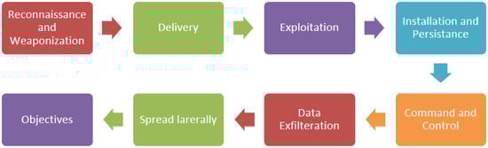The first stage is Reconnaissance and weaponization in which the attackers find the weakness and vulnerability of the system. This may belong to the hardware side, namely the CPU, memory, communication device’s antenna, and sim card, or the software side, namely zero-day vulnerabilities, continued use of old patches, and a weak encryption algorithm. The next step after finding the target is the preparation of the threat and payload so that Malware is delivered to the user. Malware can be delivered either by a direct approach (user responsible), including E-Mail, SMS, or a malicious Link on malicious websites, or an indirect approach (attacker’s experience), including an encrypted/encoded link, an active directory attack, privilege escalation, the directory access method, adware, etc. After the malware is transmitted, the following phase is Exploitation, or payload, which refers to the activities that malware performs. At this stage, it may participate in an active attack or passive attack. Active attacks are masquerade attacks such as login access or a bypass, session hijacking/reply attack, message modification using a change in header by taking advantage of weak cryptography algorithms, a Denial of Service/Distributed DoS (DoS/DDoS) attack causing flooding, and malformed data. Possible passive attacks are the monitoring of network traffic, scanning of open ports and vulnerabilities, eavesdropping, footprinting, spying, and dumpster driving (information collected from discarded devices and the recycle bin).