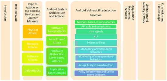 The structure of this paper is as follows: Section 2 highlights work related to Malware, the most famous attack on digital systems. Section 3 focuses on the architecture of the Internet of Things (IoT), industrial IoT (IIoT), different attacks, and mitigation proposed by several researchers, i.e., physical, network, data attacks, and software attacks. Section 4 explains details of the Android architecture, vulnerabilities in the Android system, and different malware detection techniques, and Section 5 focuses on application-hardening techniques applicable for any kind of digital system, but especially in the context of IoT and Android. Section 6 concerns the novelty and limitations of the article, and finally, Section 7 presents the conclusion and future work. The taxonomy of this presentation is shown in Figure 2.
