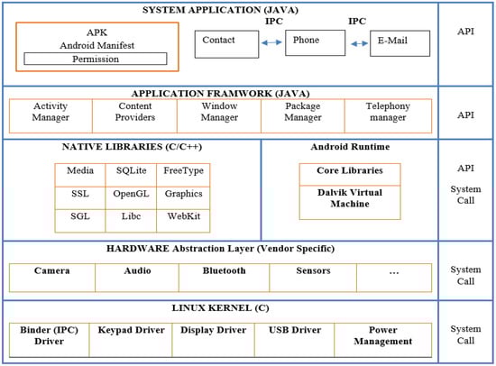 In November 2007, Android was unveiled by Google and the Open Handset Alliance (OHA). As per the latest report of the International Data Corporation, nearly 85 percent of mobiles are using the Android operating system. In 2020, Google revealed that 400 million devices were running Android version 10, and the latest version is Android 11. Android has four types of components: Activities, services, content providers, and broadcast receivers. With the rising number of users, the number of threats and exploitations are also rising. According to the authors of the work [], malware developers inject code into the service component that runs in the hidden layer without the concern of the user. The first Android Malware included DroidSMS, which targeted SMS services, and TapSnake, which transmitted GPS locations. Recently, CamScanner, which has millions of downloads from the GooglePlay store, was detected as malware in Android OS. The research conducted by Kaspersky on 5000 applications recorded more than 1000 cases of known vulnerabilities and 700 zero-day vulnerabilities. Therefore, a deep understanding of Android Devices, Architecture, and Android applications is a vital requirement. The overall Android architecture is presented in Figure 3. Attacks and exploit are possible at every layer, including hardware and drivers used to run devices.