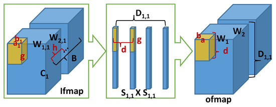 In , an ifmap tile of Layer 1 with the size of is first read from the DRAM. After transmitting the ifmap tile into the on-chip global buffer, one filter of the jth sublayer in Layer 1, with the size of where , is fetched. With these ifmaps and filters, the corresponding ofmap data of Layer 1 (i.e., the ifmap of Layer 2 with the size of ) can be generated. Then, the corresponding filers of Layer 2 will be read from the DRAM. Because only one channel of the imaps of Layer 2 is on-chip, only one channel in the filter of the jth sublayer in Layer 2 (in size of ) is required to be fetched for the convolutional computations. Consequently, by using the on-chip ifmaps and weights, the corresponding psum of Layer 2 with the size of can be generated and saved on-chip. Then, by reading only one new channel of the next filter of Layer 2 from the DRAM, another psum of Layer 2 can be generated by using the already on-chip ifmaps. Finally, the psums of Layer 2 can be generated in this loop, and the corresponding on-chip buffer should be reserved for the storage of these psums for further accumulation. When the on-chip ifmaps of Layer 2 have been completely reused, they are discarded, and new filters of Layer 1 are fetched for the generation of the new ofmaps of Layer 1. After the corresponding psums of Layer 2 have been fully accumulated, the results are transmitted to the DRAM as the ofmap tile in the jth sublayer. When the on-chip ifmaps of Layer 1 have been fully reused, the next ifmap tile is loaded and the above steps are repeated.