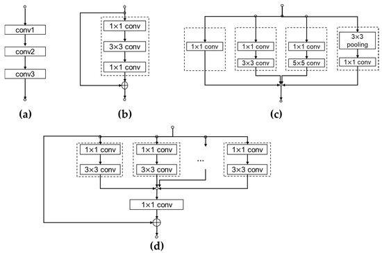 Typical modules in modern networks: (a) normal CONV layers such as those in AlexNet and VGG; (b) Bottleneck block in ResNet; (c) Inception module in GoogLeNet; and (d) Network-in-Neuron in ResNeXt.