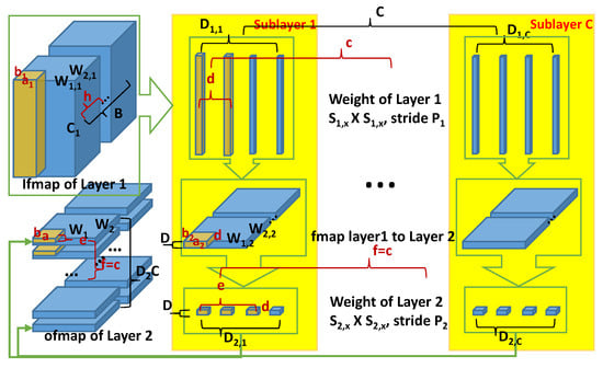 According to the discussion on single-layer-based dataflow, the optimal dataflow problem can be thought of as how to partition ifmaps and weights into small tiles for efficient data reuse so as to minimize the total amount of off-chip memory access with the limited capacity of on-chip memory. As with the single-layer-based dataflow shown in Figure 1, the dataflow of the fused 2-layer (F2L) is shown in Figure 3, in which there are sublayers (i.e., Cardinality), and each of them has two layers, indicated as Layer 1 and Layer 2. It is worth noting that although this paper mainly discusses data reuse in two fused CONV layers, the idea of the proposed analysis and exploration can be extended to the cases with more CONV layers being fused together in a similar way and can also be applied to be combined with CONV layers with FC layers and pooling layers.