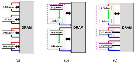 To determine the optimal data reuse strategy with proper tiling parameters, SmartShuttle, a layer-wise data reuse exploration method, was proposed in [11]. Unlike previous approaches [10,13,14,15], in which all the layers adopt the same data reuse strategy, SmartShuttle can adaptively select the most suitable data reuse strategy for each layer. In addition to SmartShuttle, the recent works [24,25,27] also belong to adaptive layer-wise data reuse approaches. They, however, still fall into the category of single-layer-based data reuse, in which no matter how large the on-chip memory is, the generated ofmap of the current layer should be stored to off-chip memory and then read back as the input of the next layer. As the networks grow deeper, the amount of this shuttling data increases, leading to larger energy consumption.