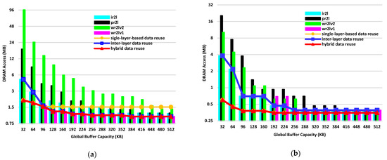 For the results in Figure 6a, the ofmap size of Layer 2 () is ; the number of input channels of Layer 1 () is 336; the number of output channels () of Layer 1 (i.e., the input channels of Layer 2) is 128; and the number of output channels () of Layer 2 is 32. The filter sizes of Layer 1 and Layer 2 ( and ) are and , respectively, and the batch size () is 3. For the results of the inter-layer data reuse methods (i.e., , , , and ), when the size of global buffer is smaller than 64 KB, achieves the minimized off-chip memory access; while when the size of global buffer is greater than 96 KB, has the best result. This explains that the proper inter-layer data reuse approach should be adaptively selected under the constraint of the on-chip memory capacity. On the other hand, when compared to the best results of single-layer-based data reuse (i.e., , , and ), it is obvious that single-layer-based data reuse always has less off-chip memory access than the inter-layer data reuse methods when the on-chip memory is small, while the inter-layer data reuse methods have better results if given a large on-chip memory. Due to the variations of the off-chip memory access in modern neural networks, this confirms that we need to select the best approach from the single-layer and inter-layer-based data reuse methods for minimizing off-chip memory access.
