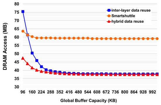 Figure 7 provides the results on the total amount of off-chip memory access of DenseNet-121 with and [4] under the various capacity constraints of the on-chip global buffer. To gain more insights, the results of the existing single-layer-based exploration method, SmartShuttle [11], are also provided for comparisons. Consistent with the results shown in Figure 6a, inter-layer reuse with two fused layers outperforms single-layer reuse with SmartShuttle when the capacity of the on-chip memory is larger than 128 KB, while single-layer reuse is suitable for DNN accelerators with small on-chip memory. Moreover, the proposed hybrid data reuse approach outperforms single-layer reuse with SmartShuttle and inter-layer reuse with two fused layers in all the cases, especially in the range that is close to the intersection of the two curves. With a 128 KB on-chip memory, the hybrid data reuse can achieve 24.3% of off-chip memory access reduction when compared to the two methods. For the capacity of on-chip memory ranging from 64 KB to 512 KB, the hybrid data reuse approach can achieve up 32.5% and 48.7% of off-chip memory access reduction when compared to single-layer reuse and inter-layer reuse, respectively. With larger on-chip memory, the benefit of the hybrid reuse over the inter-layer reuse becomes less because most of the off-chip memory access reduction is achieved by inter-layer data reuse, while the case shown in Figure 6b occupies only a small proportion. With 1 MB on-chip memory, the hybrid reuse requires 0.7% less DRAM access than the inter-layer reuse. It is worth noting that when the capacity of the on-chip memory becomes large enough, the required amount of DRAM accesses would become saturated; however, larger memory requires more power consumption.
