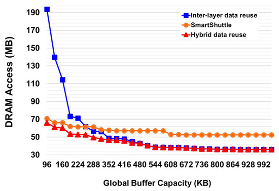 The result of ResNeXt is shown in Figure 9, which is similar to that of DenseNet shown in Figure 7. For ResNeXt, the intersection point of single-layer reuse with SmartShuttle and inter-layer reuse with two fused layers exists when the capacity of the on-chip memory is 256 KB. When the on-chip memory becomes larger, inter-layer reuse outperforms single-layer reuse, and up to 20.5% of the DRAM access can be reduced. Meanwhile, as with that in DenseNet, the hybrid reuse can always obtain better results than both the single-layer reuse with SmartShuttle and the inter-layer reuse with two fused layers. Although hybrid reuse obtains the same results as inter-layer reuse does when the on-chip memory becomes larger than 480 KB, for the capacity of on-chip memory ranging from 64 KB to 576 KB, the hybrid data reuse approach can achieve up to 20.5% and 66.9% of off-chip memory access reduction when compared to single-layer reuse and inter-layer reuse, respectively.