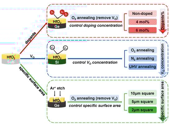 Figure 1 shows the experiment process designed to control doping, VO, and specific surface area separately. For controlling doping singly, quadrivalent Si dopants were selected because they do not induce VO in the film like trivalent cation, and O2-PDA was carried out for eliminating the VO generated in film deposition. Meanwhile, employment of Ge substrate and PDA process help to minimize the interface effect such as inducing extra VO or stress. While for controlling Vo independently, undoped HfO2 films were annealed in O2, N2, or UHV respectively. Similarly, the PDA process was employed, but the Si substrate was selected because less leakage is induced on Si than on Ge in UHV-PDA. While for the individual control of the specific surface area, undoped HfO2 films were etched into different sizes before annealing to explore its impact, while Ge substrate and PDA were also employed for the reasons stated above.