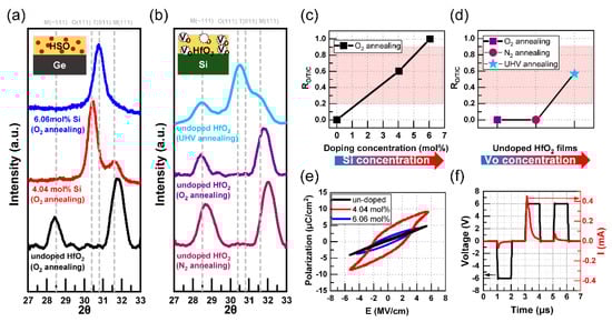 Firstly, we consider the independent effect of doping concentration and VO on the ferroelectric phase of HfO2 thin films. GIXRD patterns of doped films with different doping concentrations and undoped-HfO2 films with different annealing conditions are summarized in Figure 2a,b. The M-phase appears at both 28.5° and 31.6°, while the peak around 30.5° is attributed to T-, O-, or cubic phases (C-phase) whose difference is difficult to distinguish solely. Therefore, it is referred to as the O/T/C phase hereafter []. In order to clarify the impact quantitatively, we extracted the O/T/C phase fraction (RO/T/C) by Gaussian peak splitting. RO/T/C is defined as the ratio of O/T/C phase peak intensity to the total intensity (I), expressed as