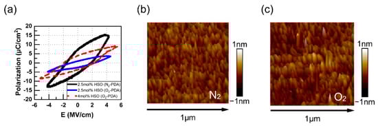 (a) P-E curves of 2.5 mol% HSO films with N2- and O2-PDA, and 4 mol% HSO films with O2-PDA. AFM results of 2.5 mol% HSO films which were annealed in (b) N2 and (c) O2, respectively.