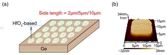 (a) Graphical presentation of cuboid array films whose side lengths were set to 2 μm, 5 μm, and 10 μm before PDA. (b) AFM diagram of one cuboid in a 10 μm array, showing that HfO2-based films were all etched.