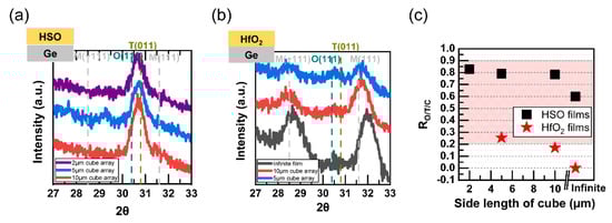 GIXRD results of (a) HSO (~4 mol% of Si) cuboid array films and (b) undoped HfO2 cuboid array films. The peak] intensity of the O/T/C phase increases with the decrease of array size. (c) Extracted RO/T/C by fitting GIXRD results in (a,b). O-phase seems formable in undoped films only by decreasing the side length.