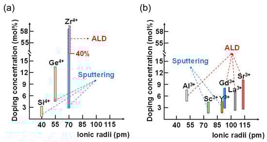 (a) Summarized doping concentration and ionic radii of (a) quadrivalent (Si, Ge, Zr) and (b) trivalent (Al, Sc, Y, Gd, La, Sr) dopants that make HfO2 films ferroelectric [,].