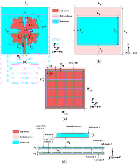 (a) Top view and (b) bottom view of the antenna; (c) top view of the AMC-MS reflector; and (d) side view of the antenna.