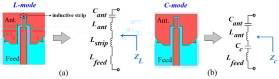 The proposed antenna operates in two coupling modes, i.e., L-mode and C-mode, as shown in Figure 2. An impedance transition feed with a short-circuited strip behaves like an inductor (L-mode), and open-circuiting acts like a capacitor (C-mode). The coupling action of the feed and bow-tie radiating fractal patch antenna exhibits induced resonance coupling behavior and operates in distinct modes. A simplified circuit model was developed to illustrate the insights of the mode coupling mechanism. The feed represents an inductance, Lfeed, which couples via the short-circuited strip, Lstrip into the antenna surface impedance parameters consisting of Lant and Cant. From Figure 2a, the L-mode equivalent impedance, ZL and resonant frequency, fL, are expressed as: