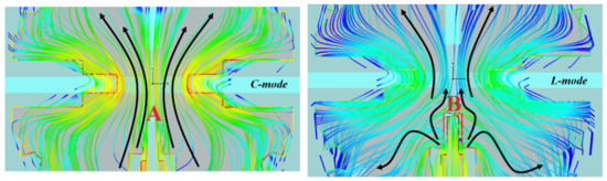 The two coupling modes can be further explained by simulated electric field streamlines. Figure 3A,B illustrates the electric field streamlines of two coupling modes. In the case of C-mode, the current at point-A are divergent due to the isolation of the feed and radiator. The isolated region has an effective stored electric field which is equivalent to the capacitance between feed and radiator. During excitation, it usually forms an equipotential region due to the induced effect. So, the field’s current streamlines are not condensed. But in the case of L-mode, the current at point-B are convergent due to the short-circuited strip between feed and radiator, and an inductive effect is generated. During the excitation, it forms a non-equipotential region due to the effect of magnetic fields that converge the currents to be condensed. So, dual mode effects are observed in the radiating surface, reported here.