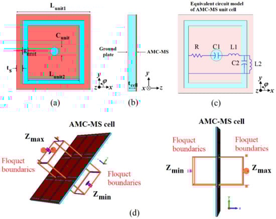 To investigate the proposed AMC-MS shown in Figure 4a,b, the unit cell structure was initially investigated and analyzed in the periodic structure template of CST MWS studio suite unit cell workflow in a frequency domain solver. Here, the unit cell consists of a checkerboard-hole-injected with a squared loop boundary at the top and a metallic ground bottom sandwiched with an FR-4 substrate, tcell = 1.6 mm, = 4.3, and tan = 0.02. Then, floquent boundary conditions are usually set into the unit cell with Zmax and Zmin as reference port terminals to obtain the reflection coefficient, dB and reflection phase (degree) shown in Figure 4d.