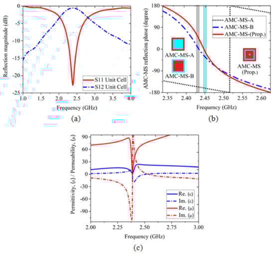 AMC-MS unit cell performance: (a) Reflection magnitude, (b) phase, and (c) permittivity () and permeability ().