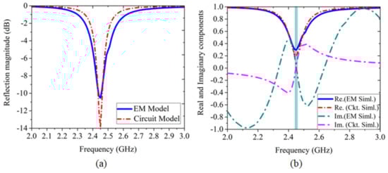 The AMC-MS unit cell had a sharp reflection S11, of magnitude −22.5 dB at 2.45 GHz, and the transmission parameter S12 almost converges to 0 dB at the same frequency, as shown in Figure 5a. Similarly, Figure 5b has an AMC-MS reflection phase at 2.45 GHz with the 0∘ reflection phase characteristic, in which all the unit cell structures are analyzed. In Figure 5c, the permittivity and permeability characteristics are shown. Here, the (AMC-MS-A, AMC-MS-B) unit-cell structures have some insignificant 0∘ phase reflection cross-overs, and the proposed AMC-MS structure validates the design of our criteria. It is to be noted that the length Lunit2 and the distance gunit can modulate the AMC 0∘ phase crossover points to higher/lower frequencies. The equivalent circuit conception of the proposed AMC-MS unit cell is shown in Figure 4c. As the circuit modeling includes cascading lumped elements, the Lunit2 represents a series R-L1-C1 unit. The outer square loop metallic boundary represents an inductance L2, whereas the gap gunit between Lunit2 and ts denotes a capacitance C2. Figure 6a shows the unit cell reflection magnitude for EM and circuit simulations, and Figure 6b gives an idea (insights) about the real and imaginary components for the same configuration.
