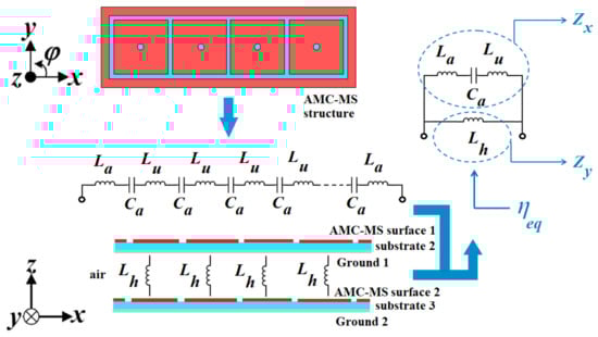 A simplified equivalent circuit model is shown in Figure 7 for the proposed AMC-MS structure [22]. The outer patch length (Lunit1) and inner patch length (Lunit2) provide inductance (La) and (Lu). The periodic gap (gunit) between the successive array of unit cells corresponds to a capacitance (Ca). Since the unit cells in the periodic array are adjacent to each other, they can be viewed as a series of LC-lumped elements. Thus, the air gap between the AMC-MS1 and AMC-MS2 provides an inductance (Lh). Thus, the resulting inductance (Lh) is in parallel to the infinite series stacked array of periodic unit cells consisting of inductances and capacitance (La, Ca, Lu). Thus, the equivalent AMC-MS impedance can be expressed as (ηeq = Zx||Zy). The resulting impedance (ηeq) and resonant frequency (feq) of AMC-MS can be calculated as [23,24]: