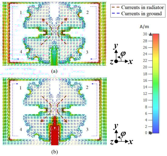 Figure 13. Surface current distributions of proposed antenna configuration: (a) without AMC-MS reflector and (b) with AMC-MS reflector. - Figure 13b shows that the field lines have symmetrically copulated when the AMC-MS layer is introduced, as a result of which, the near-field radiated waves participate in the coupling process due to in-phase field components of the AMC-MS reflector and contribute to higher radiation energy in the + z-axis. The presence of DMS combines the reflective field energy to effectively couple in the cavity-backed ground aperture, so boresight radiation energy is improved.