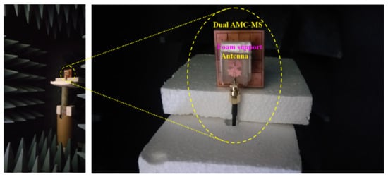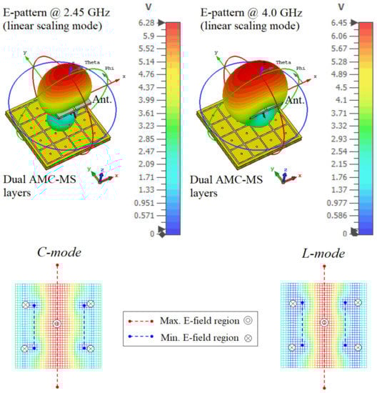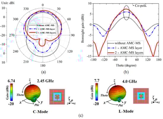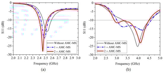 - In Figure 10a, for C-mode, the impedance matching characteristics are shown for both with and without AMC-MS cases. Due to the effects of dual-loaded AMC-MS layers, the center frequencies are shifted to the lower bands. It can be seen that matching characteristics have been improved by >25 dBi at 2.45 GHz, with the dual AMC-MS. Similarly, impedance improvement effects with wideband can be observed for L-mode at 4.0 GHz in Figure 10b, with dual AMC-MS. Thus, the improvements in impedance matching in both modes are due to the effective coupling process, where the radiation and reflection waves are sufficiently coupled between the antenna and AMC-MS.