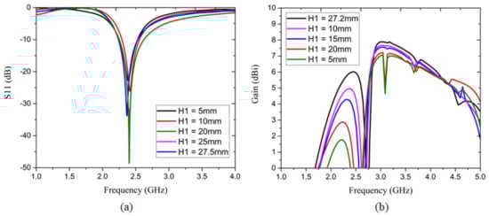 Figure 12. Parametric study showing the variation of “H1” on (a) S11, dB and (b) Gain, dBi. - The boresight gain at = 0∘ (+ z-axis) shows an improvement in radiation performance with dual AMC-MS layers. The 3D radiation pattern at the centered frequencies for two operating modes is shown in Figure 11c. Then, the C-mode and L-mode antenna configurations’ performance summaries are presented in Table 2. Furthermore, the back lobe radiation characteristics at the corresponding modes are depicted in Table 3.