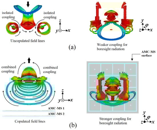 - In Figure 13a, the field’s current lines are uncopulated. The isolated loop formation of currents provides weaker coupling energy; hence, all near-field radiated waves do not participate in the coupling process.