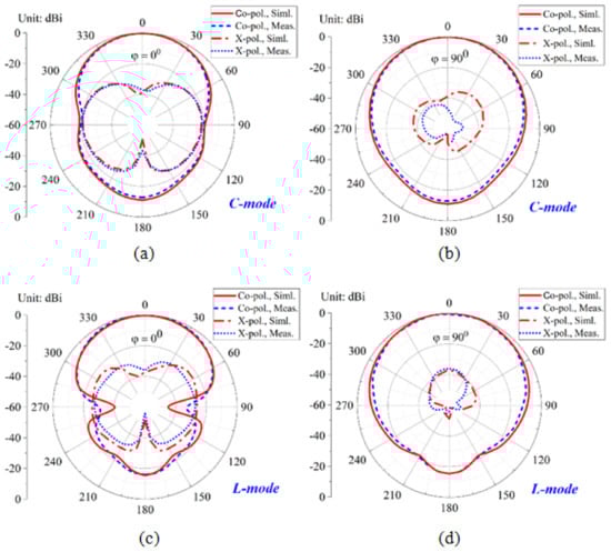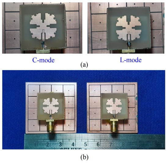 To validate the proposed antenna, a prototype was fabricated and is shown in Figure 14. The S11 parameter was measured by the PNA series Microwave Network Analyzer (Model: N5222A) from Agilent technologies, and its radiation pattern was measured in a far-field anechoic chamber. Figure 15a,b shows the S11 plots for two operating modes. For C-mode, the simulated S11 ranged from 2.39 to 2.53 GHz, a bandwidth of 0.14 GHz, whereas the measured response had an S11 of 2.33–2.57 GHz, a bandwidth of 0.24 GHz. For L-mode, the simulated S11 ranged from 2.88 to 4.49 GHz, a bandwidth of 2.21 GHz, whereas the measured response had S11 of 2.91–4.53 GHz, a bandwidth of 1.62 GHz. Due to the inductance effect, sharp resonance was observed at 3.1 GHz. However, the measured responses accommodate LTE/4G/5G wireless bands. Further, the radiation plots (measurement setup) for both operating modes measured in an anechoic chamber are shown in Figure 16. For C-mode and L-mode, centered at 2.45 and 4.0 GHz, respectively, the radiation plots for = 0∘ and = 90∘ are shown in Figure 17.
