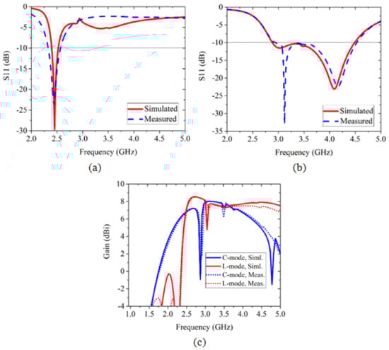Simulated and measured S-parameters (S11, dB): (a) C-mode, (b) L-mode, and (c) Gain, dBi in both operating modes at their desired operating bands.
