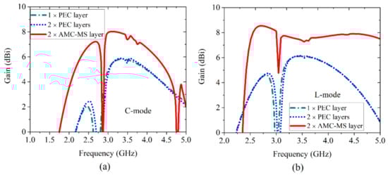 Comparison of simulated gain plots of the proposed antenna configuration: (a) C-mode and (b) L-mode, using PEC and AMC-MS reflectors.