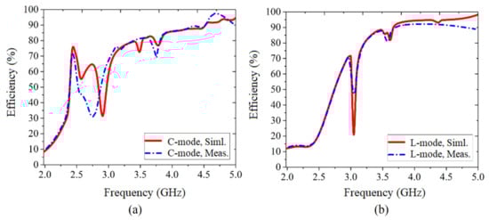 The simulated and measured antenna efficiency plots of the proposed antenna configuration: (a) C-mode and (b) L-mode.