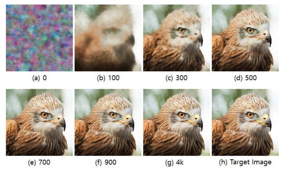 Figure 3 shows the example reconstructed images for different numbers of iterations in DIP. Comparing the reconstructed image after 700 iterations, Figure 3e, with the target image, Figure 3h, it can be seen that the image under reconstruction has much fewer high-frequency features (noise). This means that DIP can also be used to remove high-frequency features (noise). Thus, if one can decide on the number of iterations where only the robust features are reconstructed, DIP can successfully be used to filter out the injected perturbation in adversarial examples.