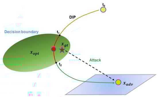 Figure 4 shows how DIP can be used to defend against adversarial attacks. The image to be reconstructed in Figure 4 is an adversarial example generated by an adversarial attack. The iterations of DIP can be divided into three stages. First, the image (between and ) is reconstructed, starting from random noise, independent of both the adversarial example and the original image . In the second stage (between and ), the reconstructed image is similar to , with only robust features reconstructed out of . Lastly, the image generated later than contains abundant non-robust features in which adversarial perturbation is hidden. Therefore, it is important to determine the second stage ( and ), during which, only robust features are reconstructed, in order to successfully filter out perturbation from an adversarial example.