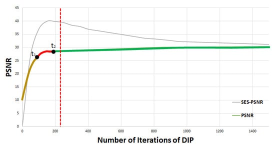 DIPDefend [17] uses Second-order Exponential Smoothing (SES)-PSNR, a method of measuring PSNR trends in reconstructed images to determine the second stage ( and ). This is a method that utilizes the fact that PSNR increases rapidly when reconstructing the robust features because most of the energy in the image is contained at a low frequency. Therefore, the point until which PSNR has risen rapidly and stopped increasing suddenly is most likely between and , and this is the point where DIP needs to stop its iterations. Figure 5 shows how SES-PSNR and PSNR change as the number of iterations of DIP increases. In Figure 5, PSNR increases as it reconstructs the robust features in the early stages of DIP iteration, which tends to converge after . Based on this, when the peak of SES-PSNR is found (between and ), DIPDefend stops reconstructing the image. SES-PSNR, denoted as , can be obtained using Equation (1). Since there is no ground-truth image (i.e., original unattacked image) available, PSNR, denoted as , is calculated using an adversarial example. used in Equation (1) represents a change in the tendency of the previous cycle and can be obtained using Equation (2).
