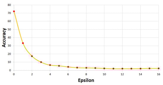 The neural network used to evaluate the proposed defense method was ResNet50 [22], which used a randomly selected 500 ImageNet [1] dataset. Figure 6 shows how the inference accuracy drops as the degree of FGSM attack increases. The values that we use in the following evaluations and their corresponding accuracies are summarized in Table 11.