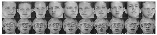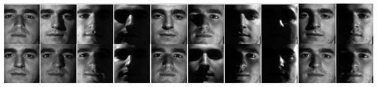 The ORL dataset, which was created by Cambridge University, contains 400 facial photos of 40 subjects with a dark uniform background under different conditions for time, light and facial expression. We resized each photo to 32 × 32. Some samples from the ORL dataset are shown in Figure 2.