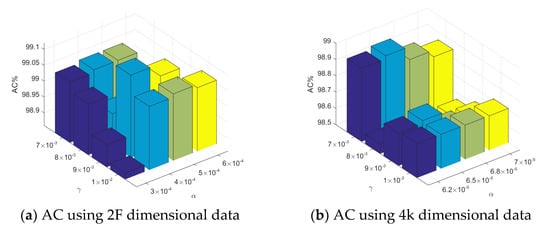 Figure 4 displays the AC values when using the Hopkins 155 dataset with different parameter settings. For 2F dimensional data, = 0.09 and . For 4k dimensional data, = 0.07 and . For both settings, . By taking the results of all motions in the Hopkins 155 dataset as the example, we could observe the changes in the AC values that were caused by the BDLSR-B method for 2F-dimensional data and those that were caused by the BDLSR-Z method for 4k-dimensional data. From Figure 4, it can be seen that the AC values fluctuated very little with the changes to α and . When , and , , the clustering effect was the best.