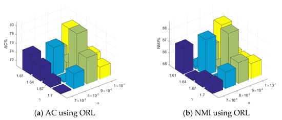 Figure 5 displays the AC and NMI values when using the ORL dataset with different parameter settings. We set = 0.07, and . To observe the changes in the AC and NMI values that were caused by the BDLSR-Z method, we took 40 individuals from the ORL dataset as the example. From Figure 5, it can be seen that the AC values changed significantly and the NMI values changed slightly within a certain value range. When and , BDLSR-Z produced the best clustering effect.