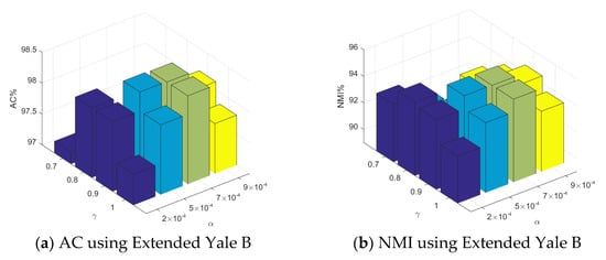 Figure 6 displays the AC and NMI values when using the Extended Yale B dataset with different parameter settings, where λ = 50, and . To observe the changes in the AC and NMI values that were caused by the BDLSR-B method, we took 5 individuals from the Extended Yale B dataset as the example. From Figure 6, it can be seen that the AC and NMI values were relatively stable. On the whole, changes in the parameters had little impact on the clustering effect.