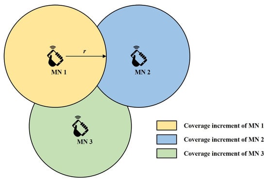 where is the coverage increment if MN j is involved in accomplishing sensing task of requester i. An example of coverage increment is shown in Figure 2, and is a user-dependent coefficient that normalize the coverage increment to requester i’s willingness to pay. We assume that the coverage radius of each MN is r. When the sensing task is assigned to MN 1, 2, and 3, sequentially, the coverage increments of MN 1, 2, and 3 are represented by the area colored yellow, blue, and green, respectively.