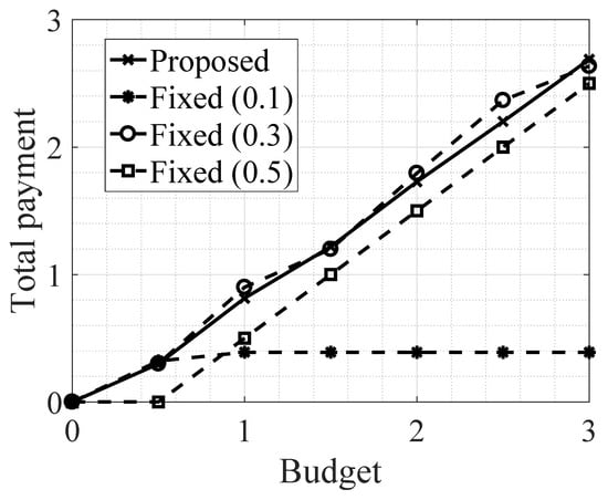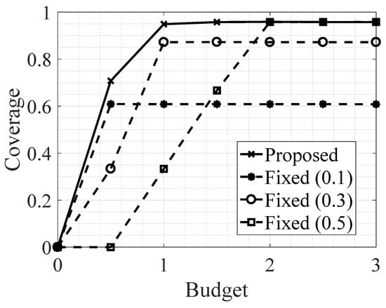 Sensing coverage is calculated as the ratio of the number of PoIs with at least one participant to the number of targeted locations. As shown in Figure 3 and Figure 4, both the total payment and sensing coverage increase along with the increasing of the budget. When the fixed reward is set to 0.1 (lower than the sensing cost of most device owners), the reward is insufficient to incentivize enough MNs to complete sensing tasks; when the fixed reward is on the other hand set to 0.5, the total budget is insufficient to recruit enough participants to achieve full sensing coverage. As depicted in Figure 4, the proposed method achieves higher sensing coverage, compared to the fixed reward schemes.