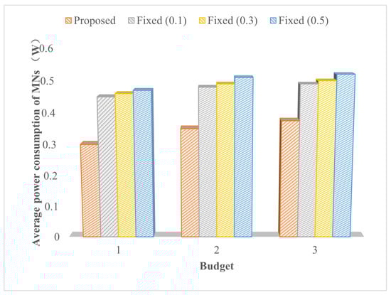 Figure 6 show the power consumption versus the monetary budget. As we can observe, the proposed algorithm outperforms the fixed one in terms of power consumption. This is because, in the proposed method, tasks rank the MNs based on the utility function that captures their power consumption. As a consequence, the proposed algorithm, by its nature, ensures that tasks will be assigned to MNs that consume low energy.