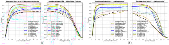 Results based on the OTB100 dataset in the background clutter, low-resolution case. (a) is the precision and success in background clutter case. (b) is the precision and success in low-resolution case.