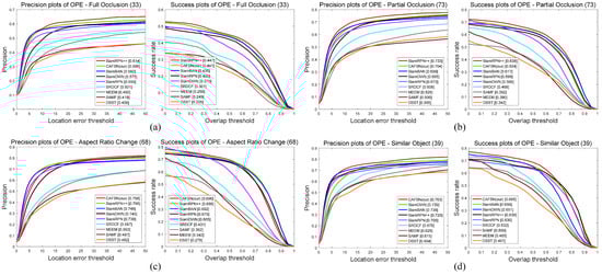 Comprehensive network performance evaluation results based on the UAV123 dataset with (a) full occlusion, (b) partial occlusion, (c) varying aspect ratios, and (d) similar targets.