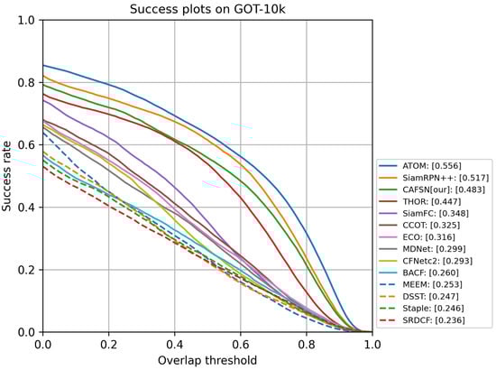 GOT-10k contains over 10,000 videos with over 1.5 million manually labeled bounding boxes. It comprises 563 target categories and 87 motion patterns. The dataset has zero overlaps with the training set, and the provided evaluation metrics include success rate graph, average overlap (AO), frames per second (FPS), and degree success rate (SR). The AO indicates the average overlap between estimated bounding and ground truth boxes. represents the ratio of successful frame tracking with more than 0.5 overlaps, and represents successful tracking with more than 0.75 overlaps. FPS represents the maximum number of frames per second that the algorithm can process in this dataset. It can be used to represent the computational complexity of an algorithm and reflect the real-time performance of the algorithm. We evaluate the proposed algorithm on GOT-10k and compared it with 13 progressive methods such as SiamRPN++, ATOM [49]. The test set embodies 84 object classes and 32 motion classes with 180 video segments, allowing efficient evaluations. Figure 12 shows the success rate graph of each algorithm on GOT-10K, and the performance of the proposed algorithm in this paper is ranked third. Table 2 shows the comparison details of different metrics. Although CAFSN is slightly weaker than ATOM and SiamRPN++ in terms of performance, our algorithm has a massive advantage in real-time tracking, approximately 2 × faster than ATOM. This result verifies that CAFSN has less computation and is simple.