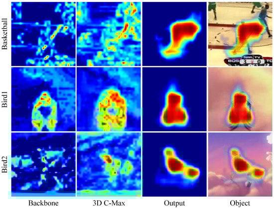 To verify the effectiveness of each component of our tracker, we implement several ablation experiments evaluated on the OTB dataset, and Table 3 shows the detailed evaluation results. We start the tuning training from the dataset, firstly using ConvNext as the backbone network and acquiring 64K image pairs on the GOT-10k dataset for training, followed by training on four datasets of ILSVRC-VID/DET, COCO, LaSOT, and GOT-10k, with an AUC improvement of 2.6% and precision improvement of 3.8%. In order to improve the target response value and suppress the effect of similar targets, the 3D C-Max Fusion proposed in this paper is used, resulting in a 1.7% improvement in AUC and a 0.5% improvement in precision. In Figure 13, the y-label indicates the sequence name of the OTB dataset, and the x-label indicates the output results of each component. The first three columns visualize the features extracted by the backbone network, the features output by the feature fusion network and the results output by the multi-branch prediction network, respectively. The last column shows the effect after superimposing the visualized prediction results onto the original image, highlighting the target more, improving the target response value, and enhancing the discrimination ability with similar targets under the effect of 3D C-Max Fusion. To suppress low-quality prediction frames and remove outliers, we designed a simple but effective quality assessment branch, which resulted in a 1.2% improvement in AUC and a 1.5% improvement in precision. Finally, 600 k image pairs were collected on four datasets for training and parameter optimization, achieving an excellent performance of 64.9% AUC and 87% precision in the OTB dataset.