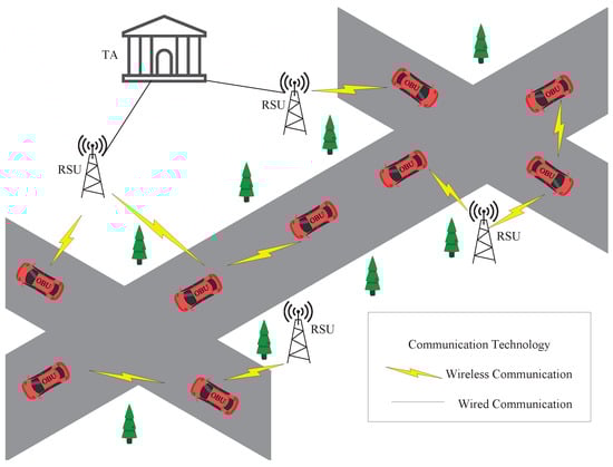 With the rapid development of intelligent transportation systems (ITSs), the number of vehicles has greatly increased, traffic jams are common and traffic accidents occur frequently [1]. In order to improve road safety and traffic efficiency, vehicle ad hoc networks (VANETs) have been widely studied. VANETs are composed of three parts [2]: a trusted authority (TA), a roadside unit (RSU) and vehicles with on-board units (OBUs). The TA is responsible for registering and issuing system parameters. The RSU is deployed on the roadside and provides services for vehicles. Vehicles are equipped with OBUs, and each OBU acts as a communication module, supporting vehicle-to-vehicle communication (V2V) and vehicle-to-infrastructure (V2I) communication. The V2V and V2I communications are wireless communications, and for a long time, the solution used was directed short-range communication (DSRC) [3]. However, with the development of wireless communication technology [4], 6G offers new opportunities for ITSs, due to its excellent functions such as ultra-low delay communication, high throughput and large-scale autonomous networks [5]. 6G-enabled VANETs provide strong support for ITSs by providing high-speed information transportation and real-time data sharing among vehicles, infrastructure and pedestrians.