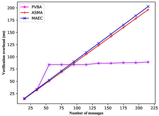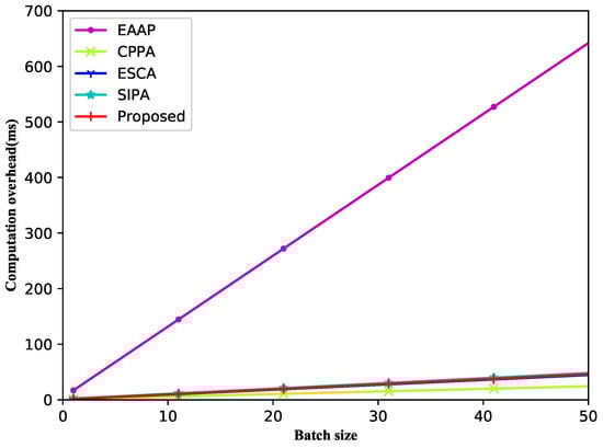 The comparison of computation overheads is given in Table 1, and Figure 2 shows the computation overheads for different batch sizes. According to Figure 2, the ASMA scheme has lower computation overheads than the EAAP [9], ESCA [21] and SIPA [22] schemes, and a slightly higher overhead than the CPPA [1] scheme. In addition, since the generation of the pseudo-identity and partial key in CPPA [1] is completed by the TA, while the pseudo-identity and secret key in the ASMA scheme are pre-generated offline, the total system overhead of CPPA [1] is higher than that of the ASMA scheme, as shown in Table 1.